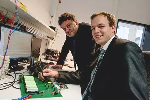 電動車輛電池可能會變得更輕,更便宜,這得益于在德國波鴻魯汶大學(xué)康斯坦丁諾斯Sourkounis教授(左)的指導(dǎo)下,由工程學(xué)生PhilipDost(右)組成的團(tuán)隊開發(fā)的新傳感器技術(shù)。(來源:Ruhr-Universit?tBochum)