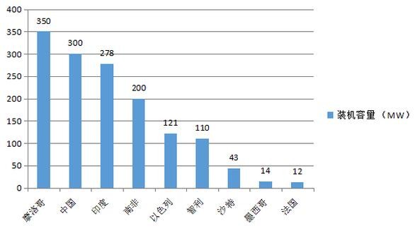 根據(jù)國際能源署太陽能熱發(fā)電和熱化學組織(SolarPACES)統(tǒng)計,截至2016年2月底,全球在建太陽能光熱發(fā)電站裝機容量約1.4GW。其中摩洛哥在建裝機容量最高,達350MW,包括裝機200MW的NOORII槽式光熱電站和裝機150MW的NOORIII塔式光熱電站。中國近幾年也開始發(fā)展光熱發(fā)電產(chǎn)業(yè),在建裝機容量位居第二位,為300MW(與國內(nèi)統(tǒng)計數(shù)據(jù)略有出入)。印度在建項目的裝機容量達278MW,位居第三位,其后是南非、以色列、智利等國。