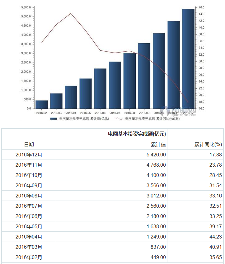以下為2016年我國(guó)電網(wǎng)基本投資完成額累計(jì)值統(tǒng)計(jì):