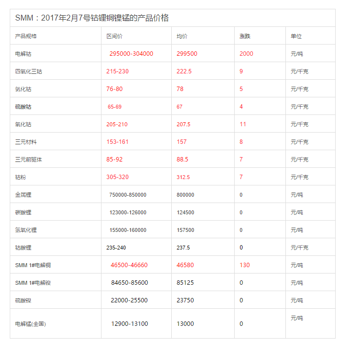 2017年2月7號鈷鋰銅鎳錳的產(chǎn)品價(jià)格