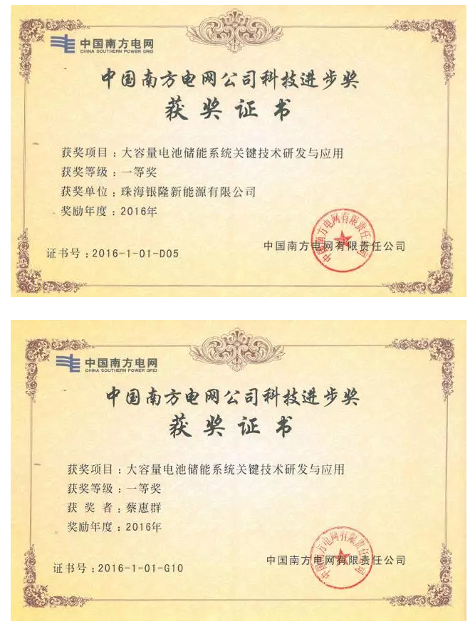 銀隆新能源參與完成的863課題“大容量電池儲能系統(tǒng)關鍵技術研發(fā)與應用”項目喜獲2016年廣東省科技二等獎,銀隆新能源作為項目參與方喜獲2016年度中國南方電網(wǎng)公司科技進步一等獎。