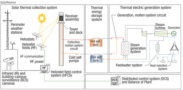 另一美國(guó)知名光熱電站開(kāi)發(fā)商SolarReserve的首席執(zhí)行官Kevin Smith認(rèn)為,光熱電站的主要優(yōu)勢(shì)在于它可以生產(chǎn)出電網(wǎng)友好型的可調(diào)度電力。這意味著與傳統(tǒng)的發(fā)電廠一樣,光熱電站產(chǎn)生的電力可以很好地滿(mǎn)足連續(xù)的用電需求,而這主要得益于光熱電站可以配置高性?xún)r(jià)比的熔鹽儲(chǔ)熱系統(tǒng)。這種儲(chǔ)熱技術(shù)并非直接蓄電(光伏和風(fēng)電一般使用蓄電池來(lái)儲(chǔ)存電力),這使得光熱電站生產(chǎn)的電力不僅可調(diào)度,而且可以實(shí)現(xiàn)24小時(shí)電力調(diào)度,且夜間不需要補(bǔ)充備用燃料。