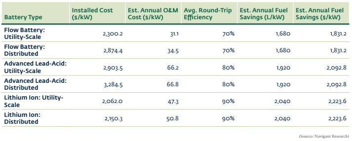 報告中特別指出,除了電網基礎設施依靠儲能系統(tǒng)可以提供更多的服務外,偏遠地區(qū)的微電網還因儲能系統(tǒng)的接入而極大地降低了對柴油發(fā)電的依賴性。在年度節(jié)油方面,公共事業(yè)規(guī)模儲能和分布式鋰離子儲能都比燃油具有更明顯的優(yōu)勢,安裝成本分別是2062美元/kW和2150.3美元/kW,節(jié)油成本均達到2223.6,美元/kW。