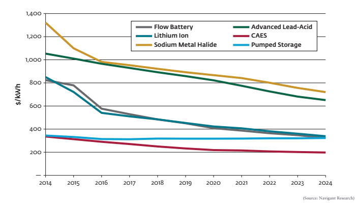 2014-2024全球公共事業(yè)規(guī)模儲能系統(tǒng)成本發(fā)展趨勢(按技術類型)