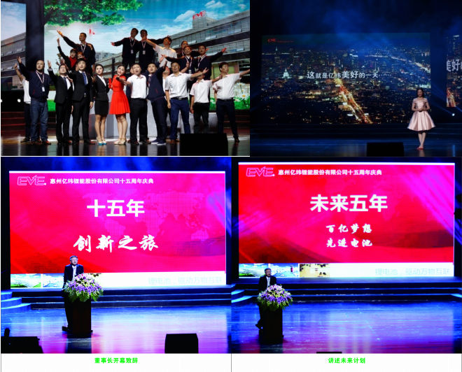 2016年6月18日,億緯鋰能十五周年慶典暨戰(zhàn)略發(fā)布晚會于惠州保利文化藝術(shù)中心舉行,1000多位嘉賓出席盛會。公司董事長兼總裁劉金成博士現(xiàn)場發(fā)布億緯鋰能重要戰(zhàn)略規(guī)劃:創(chuàng)新!一方面堅持進行新技術(shù)、新產(chǎn)品的創(chuàng)新;另一方面堅持生產(chǎn)方式的創(chuàng)新,以自主研發(fā)與引進國際先進生產(chǎn)設備相結(jié)合進行生產(chǎn)方式創(chuàng)新。堅定的表達出“做世界最好的鋰電池,成為行業(yè)領先企業(yè)”的美好愿景。全體億緯人立足于做好標準化、知識化、自動化等六件事情,磨礪工匠精神,努力實現(xiàn)2017年鋰電池國際領先的戰(zhàn)略目標。