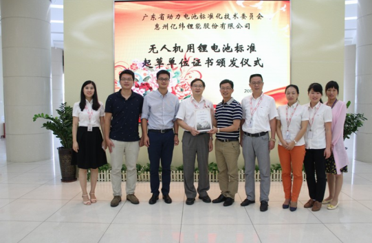 公司牽頭的地方標準《DB44T 1771-2015分箱式充電機通用技術(shù)條件》通過評審,被授予突出貢獻獎,于2016年4月由廣東省質(zhì)量技術(shù)監(jiān)督局批準發(fā)布實施;《電子煙用鋰離子電池 安全要求》,通過立項,征求意見階段;參與的《DB44/T 1885-2016無人機用鋰電池電池組 技術(shù)要求》于2016年9月通過廣東省產(chǎn)品質(zhì)量監(jiān)督批準局發(fā)布。同時還參與了《電動汽車用鋰電池管理系統(tǒng)》和《純電動及混合動力電動汽車電池系統(tǒng)安全要求》、《平衡車用鋰離子電池》、《電動汽車用電池系統(tǒng)環(huán)境適應性試驗方法》、《營運電動車輛綜合性能檢測要求及方法》、《電動汽車充電站運行和服務規(guī)范》等近10項地方標準制修定,標準分布在電池安全、電池管理系統(tǒng)、充電站等。2016年8月,廣東省產(chǎn)品質(zhì)量監(jiān)督檢驗研究院、廣東省動力電池標準化技術(shù)委員會授牌億緯鋰能為“無人機用鋰電池”地方標準起草單位。