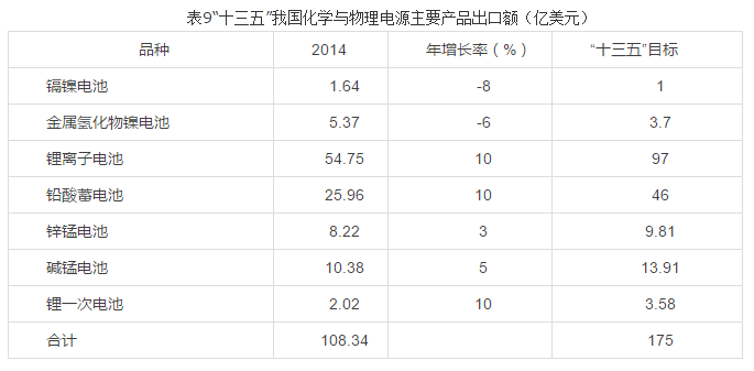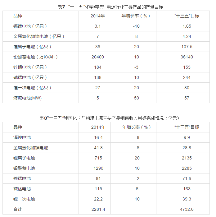 新能源產(chǎn)業(yè)作為國家“十三五”重點發(fā)展領(lǐng)域已無懸念,化學(xué)與物理電源產(chǎn)業(yè)是新能源產(chǎn)業(yè)的重要組成部分,“十三五”期間仍將保持持續(xù)、快速增長,其中傳統(tǒng)的化學(xué)電源將進(jìn)入平穩(wěn)發(fā)展期,產(chǎn)業(yè)增長重點在“動力電池、儲能電池和傳統(tǒng)電池應(yīng)用”三大領(lǐng)域,增長貢獻(xiàn)率較大的主要電池品種有新發(fā)展IT、純電動車動力與儲能鋰離子電池和新型液流電池等;傳統(tǒng)汽車和新型汽車起停以及通信應(yīng)用鉛酸蓄電池(含鉛碳電池等)和不斷擴(kuò)展應(yīng)用的鋰一次電池。2020年,我國化學(xué)與物理電源行業(yè)中的化學(xué)電源產(chǎn)品總產(chǎn)值將達(dá)到4000-5000億元左右,年平均增長率10-20%;鋰離子電池、鉛酸蓄電池將持續(xù)成為化學(xué)與物理電源行業(yè)的支柱產(chǎn)業(yè),鉛酸蓄電池保持平均8-10%增長,鋰離子電池年平均增長率20-30%;我國化學(xué)電源出口仍將保持持續(xù)快速增長的態(tài)勢,年平均增長率10-15%,出口品種增加,檔次提高,鋰離子電池將占出口總額的 55%以上?!笆濉蹦?,我國化學(xué)電源主要產(chǎn)品的產(chǎn)量、銷售收入和出口額目標(biāo)分別見表 7、8、9。