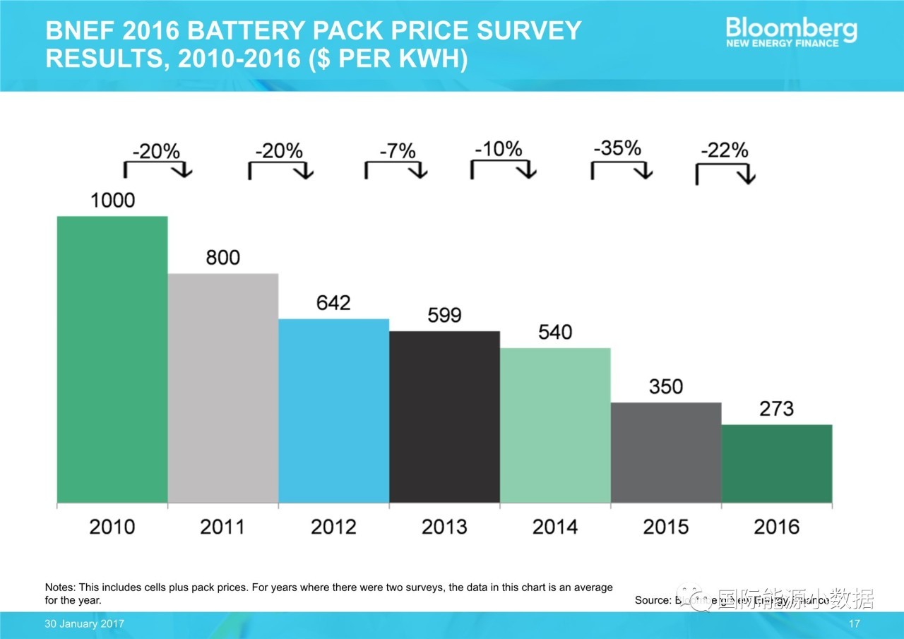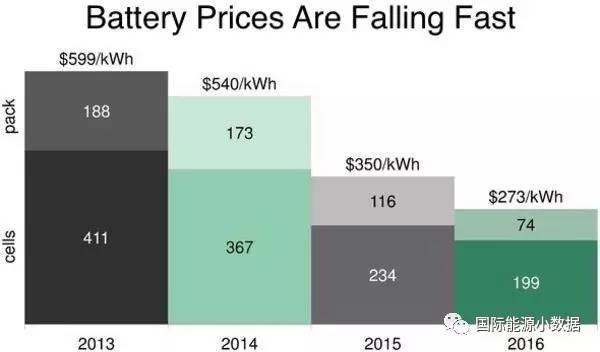 中國儲能網訊:根據彭博新能源財經的調查統(tǒng)計,鋰電池儲能系統(tǒng)價格自2010年以來持續(xù)下跌。2013年到2016年超過一半,從599美元/KWh(其中電池成本411美元/KWh)跌至2016年的273美元/KWh(其中電池成本199美元/KWh)。