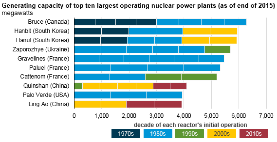 近年來,全球十大核電站名單發(fā)生了變化。日本的三座核電站已不在名單之上。這三座核電站每座發(fā)電容量超過4000兆瓦,在福島第一核電站事故后停止運行。而中國兩座核電站躋身十大核電站新名單,分別是秦山核電站和嶺澳核電站。中國正在增建大型核電站。例如,2015年底,位于中國大連附近的紅巖河核電站容量為3183兆瓦,但隨著2016年另一個1000兆瓦的反應(yīng)堆的啟動,該電站當(dāng)前容量達(dá)4183兆瓦,此外還有兩座反應(yīng)堆在建中。