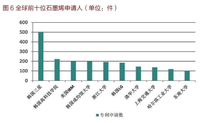 在全球主要優(yōu)先專利申請(qǐng)件數(shù)排位中,中國、韓國和美國名列前三名,分別為 6741、2892 和 2632 件。在全球前十位石墨烯申請(qǐng)人中,中國研究機(jī)構(gòu)占了 5 位,全部為中國高校,但第 1、3、6 名均為韓國和美國大型跨國企業(yè)。通過對(duì)專利技術(shù)的觀察,國外高校和企業(yè)掌握了大量核心專利,而且專利布局更偏向石墨烯的產(chǎn)業(yè)化應(yīng)用,在石墨烯產(chǎn)業(yè)化進(jìn)程中扮演著重要角色。中國雖然在石墨烯專利數(shù)量上位列世界第一,但是企業(yè)參與主體和石墨烯應(yīng)用技術(shù)多方面布局還需加強(qiáng)。