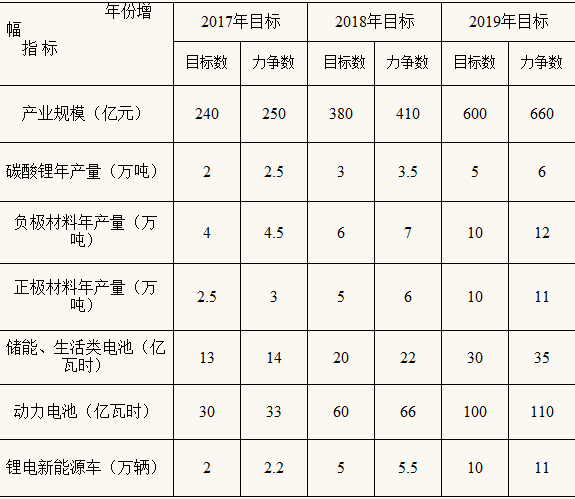 以宜春國(guó)家鋰電高新技術(shù)產(chǎn)業(yè)化基地為依托,大力引進(jìn)和培育一批骨干龍頭企業(yè),重點(diǎn)打造碳酸鋰、鋰電池材料、動(dòng)力及儲(chǔ)能鋰電池和新能源車(chē)四大生產(chǎn)基地,著力推進(jìn)鋰電新能源產(chǎn)業(yè)做大做強(qiáng),朝千億目標(biāo)邁進(jìn)。到2019年,每年新簽約鋰電項(xiàng)目30個(gè)、開(kāi)工20個(gè)、投產(chǎn)10個(gè)以上;碳酸鋰年產(chǎn)量達(dá)5萬(wàn)噸;電池正極材料年產(chǎn)量10萬(wàn)噸、負(fù)極材料年產(chǎn)量10萬(wàn)噸;動(dòng)力鋰電池、儲(chǔ)能及生活類(lèi)電池分別達(dá)到100億瓦時(shí)、30億瓦時(shí);各類(lèi)鋰電新能源車(chē)生產(chǎn)規(guī)模達(dá)到10萬(wàn)輛;主營(yíng)業(yè)務(wù)收入超5億元企業(yè)30家,其中超10億元15家,50億元2—3家,100億元1—2家。力爭(zhēng)鋰電新能源產(chǎn)業(yè)主營(yíng)業(yè)務(wù)收入達(dá)660億元。