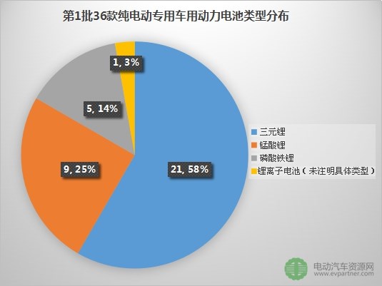 2017年新能源汽車(chē)國(guó)家補(bǔ)貼政策規(guī)定,純電動(dòng)專(zhuān)用車(chē)裝載動(dòng)力電池系統(tǒng)質(zhì)量能量密度不低于90Wh/kg。第1批目錄共36款純電動(dòng)專(zhuān)用車(chē)入選,其動(dòng)力電池供應(yīng)商(含組合)有:星恒電源(9款)、上海德朗能(5款)、惠州比亞迪(4款)、遠(yuǎn)東福斯特(4款)、深圳比克(2款)、百順?biāo)蓾?天津)(1款)、北京國(guó)能(1款)、河南新太行(1款)、江蘇智航(1款)、力神動(dòng)力(1款)、力神動(dòng)力/上海德朗能(1款)、深圳比克/惠州億緯鋰能(1款)、遠(yuǎn)東福斯特/江西迪比科(1款),另有4款純電動(dòng)專(zhuān)用車(chē)配套動(dòng)力電池不明。