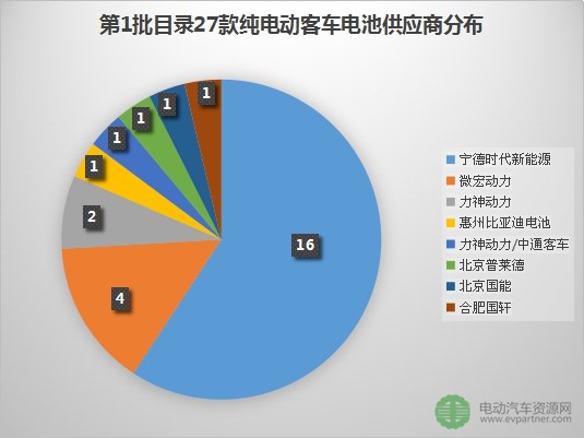 第1批目錄共27款純電動(dòng)客車(chē)入選,其中非快充類(lèi)客車(chē)23款、快充類(lèi)客車(chē)4款。為這27款純電動(dòng)客車(chē)提供動(dòng)力電池的企業(yè)(含組合)共8個(gè),分別為:寧德時(shí)代新能源(16款)、微宏動(dòng)力(4款)、力神動(dòng)力(2款)、惠州比亞迪電池(1款)、力神動(dòng)力電池系統(tǒng)有限公司/中通客車(chē)控股股份有限公司(1款)、北京普萊德(1款)、北京國(guó)能(1款)、合肥國(guó)軒(1款)。從數(shù)據(jù)可以看出,寧德時(shí)代新能源已成為這27款純電動(dòng)客車(chē)動(dòng)力電池供應(yīng)商的絕對(duì)主力。