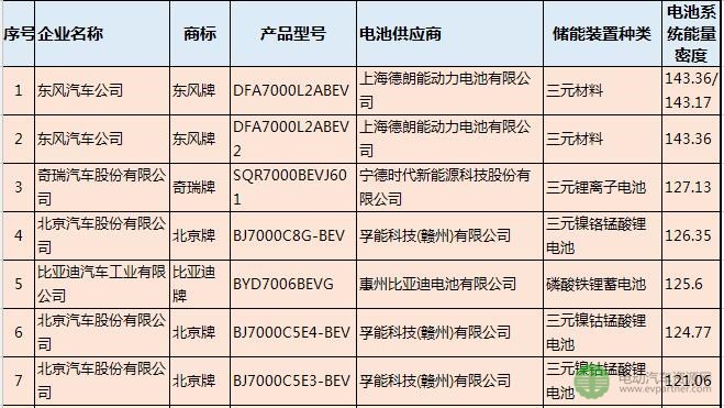 根據(jù)整理,2017年第1批目錄共有7款純電動(dòng)乘用車(chē)的電池系統(tǒng)質(zhì)量能量密度高于120Wh/kg,可獲得1.1倍補(bǔ)貼。這7款純電動(dòng)乘用車(chē)的動(dòng)力電池有3款來(lái)自孚能科技(贛州)有限公司,2款來(lái)自上海德朗能動(dòng)力電池有限公司,1款來(lái)自寧德時(shí)代新能源科技股份有限公司,1款來(lái)自惠州比亞迪電池有限公司。其中動(dòng)力電池系統(tǒng)質(zhì)量能量密度最高為143.36Wh/kg,來(lái)自上海德朗能動(dòng)力電池有限公司,電池類(lèi)型為三元材料電池。此外,惠州比亞迪電池有限公司的磷酸鐵鋰電池能量密度達(dá)到125.6Wh/kg。7款純電動(dòng)乘用車(chē)型及配套動(dòng)力電池信息見(jiàn)下表: