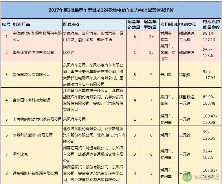 進(jìn)入2017年第1批推薦車(chē)型目錄的純電動(dòng)車(chē)型共124款,其中純電動(dòng)乘用車(chē)61款、純電動(dòng)客車(chē)27款、純電動(dòng)專(zhuān)用車(chē)36款。經(jīng)統(tǒng)計(jì),為上述124款純電動(dòng)車(chē)型配套的動(dòng)力電池供應(yīng)商(含組合)共35個(gè),包括寧德時(shí)代新能源、惠州比亞迪電池、星恒電源、合肥國(guó)軒、上海德朗能、孚能科技(贛州)、深圳比克、遠(yuǎn)東福斯特新能源、北京普萊德、微宏動(dòng)力、河南新太行電源、力神動(dòng)力電池系統(tǒng)、浙江超威創(chuàng)元、北京國(guó)能電池、多氟多(焦作)新能源、湖州天豐電源、重慶長(zhǎng)安新能源汽車(chē)、百順?biāo)蓾?天津)動(dòng)力電池、東莞市創(chuàng)明電池、湖南桑頓新能源、惠州億緯鋰能、江蘇天鵬電源、江蘇智航新能源、上海航天電源、上??托履茉?、萬(wàn)向A一二三系統(tǒng)、天津市捷威動(dòng)力、江西迪比科、浙江天能能源等。124款純電動(dòng)車(chē)型的動(dòng)力電池廠商與車(chē)廠的具體配套關(guān)系見(jiàn)下表: