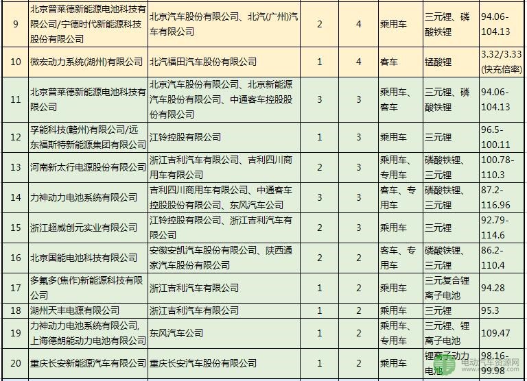 2.配套純電動(dòng)車(chē)型數(shù)量在9款(含)以下、4款(含)以上的動(dòng)力電池企業(yè)(含組合)有8個(gè),分別是:星恒電源、合肥國(guó)軒、上海德朗能、孚能科技(贛州)、深圳比克、遠(yuǎn)東福斯特新能源、北京普萊德新能源電池科技有限公司/寧德時(shí)代新能源科技股份有限公司、微宏動(dòng)力。