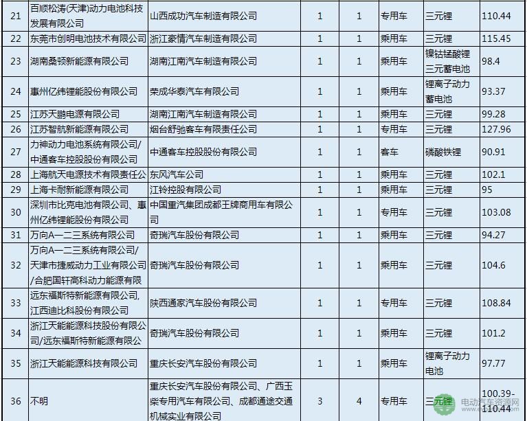 5.配套純電動(dòng)車(chē)型數(shù)量為1款的動(dòng)力電池企業(yè)(含組合)有15個(gè),分別是:百順?biāo)蓾?天津)動(dòng)力電池、東莞市創(chuàng)明電池、湖南桑頓新能源、惠州億緯鋰能、江蘇天鵬電源、江蘇智航新能源、力神動(dòng)力電池系統(tǒng)有限公司/中通客車(chē)控股股份有限公司、上海航天電源、上??托履茉?、深圳市比克電池有限公司/惠州億緯鋰能股份有限公司、萬(wàn)向A一二三系統(tǒng)、萬(wàn)向A一二三系統(tǒng)有限公司/天津市捷威動(dòng)力工業(yè)有限公司/合肥國(guó)軒高科動(dòng)力能源有限公司、遠(yuǎn)東福斯特新能源有限公司/江西迪比科股份有限公司、浙江天能能源科技股份有限公司/遠(yuǎn)東福斯特新能源有限公司、浙江天能能源等。此外,還有來(lái)自重慶長(zhǎng)安汽車(chē)股份有限公司、廣西玉柴專(zhuān)用汽車(chē)有限公司、成都通途交通機(jī)械實(shí)業(yè)有限公司的4款純電動(dòng)專(zhuān)用車(chē)電池供應(yīng)商不詳。