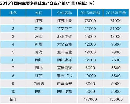 在多晶硅方面,2015年全國產(chǎn)量排名前十的企業(yè)產(chǎn)能總計(jì)達(dá)到17.7萬噸,產(chǎn)量約為15.3萬噸,分別占全國總產(chǎn)能、產(chǎn)量的93.2%、92.7%。