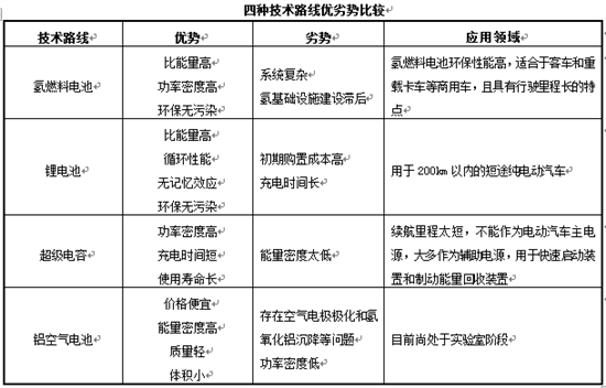 目前在車用動力源方面,主要有四種技術(shù)路線:鋰離子電池、氫燃料電池、超級電容和鋁空氣電池。其中鋰離子電池、超級電容和氫燃料電池得到廣泛的應(yīng)用,而鋁空氣電池尚處于實(shí)驗(yàn)室研究階段。能源補(bǔ)給方面,鋰離子電池、超級電容適用于純電動汽車,但是需要外部充電,而氫燃料電池汽車則需要外部氫氣加注,鋁空氣電池則需要補(bǔ)充鋁板和電解液。就目前來看,鋰離子電池在未來相當(dāng)長的一段時間內(nèi)還是要占據(jù)主要發(fā)展空間的。