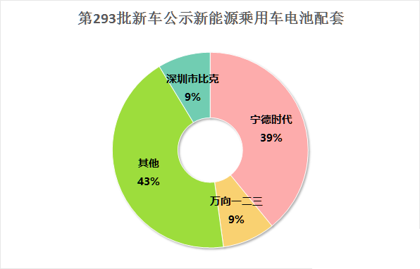 從電池配套的情況來(lái)看,第293批新車(chē)公示新能源乘用車(chē)配套電池企業(yè),寧德時(shí)代是最大贏家,共與6家企業(yè)合作,為9款車(chē)型配套,占比39%。