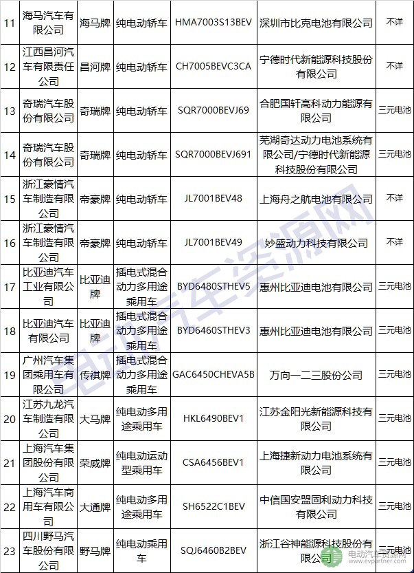 經(jīng)電動(dòng)汽車(chē)資源網(wǎng)統(tǒng)計(jì),進(jìn)入此次推薦目錄的23款新能源乘用車(chē)共來(lái)自12家汽車(chē)制造商,分別是:北汽(3)、比亞迪(2)、東風(fēng)汽車(chē)(3)、東風(fēng)裕?。?)、廣汽(3)、海馬汽車(chē)(2)、九龍汽車(chē)(1)、昌河汽車(chē)(1)、奇瑞汽車(chē)(2)、上汽(2)、四川野馬(1)、吉利汽車(chē)(2)。