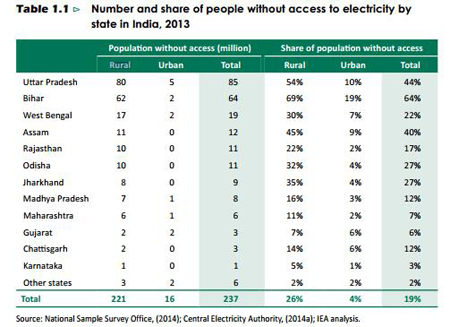 印度各邦城市(Urban)、農(nóng)村(Rural)無電人口數(shù)與比例(2013),來源:國際能源署印度能源展望報(bào)告(2015)