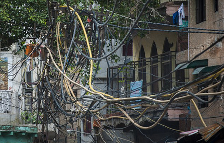 低垂的、相互纏繞的電線已成為印度的一處景觀。分布在城市中的貧民窟民眾私自從公共電網(wǎng)拉線,對(duì)他們來說,用電既無電表更不用付錢,由富有的業(yè)主間接買單。無序的布線還催生了大量草根電工,他們赤手空拳,只需一把鉗子,對(duì)電線一番拉扯后就能在停電之后重獲光明。世界銀行曾指出,印度每年因偷電而導(dǎo)致的損失,使得GDP下降了1.5%。新德里電視臺(tái)(NDTV)此前的一項(xiàng)調(diào)查顯示,印度電力用戶中有40%是沒有交費(fèi)的。印度農(nóng)村電氣化集團(tuán)曾透露,印度農(nóng)村電力盜竊量占配電總量的比例已經(jīng)超過20%。