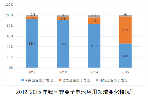 2015年我國鋰離子電池累計完成產(chǎn)量56.0億自然只,同比增長3%[國家統(tǒng)計局]。雖然我國鋰離子電池產(chǎn)量僅實現(xiàn)小幅增長,但鋰電池應用領域卻發(fā)生了根本性變革,動力型鋰電池市場份額首次超過消費型鋰電池,達到52%,較2014年提升了約39個百分點。預計今后動力型鋰電池將繼續(xù)主導鋰電池市場,消費型鋰電池市場還會進一步下滑,另外隨著動力電池梯次利用技術在儲能市場的逐步成熟,儲能型鋰電池市場規(guī)模將會擴大。