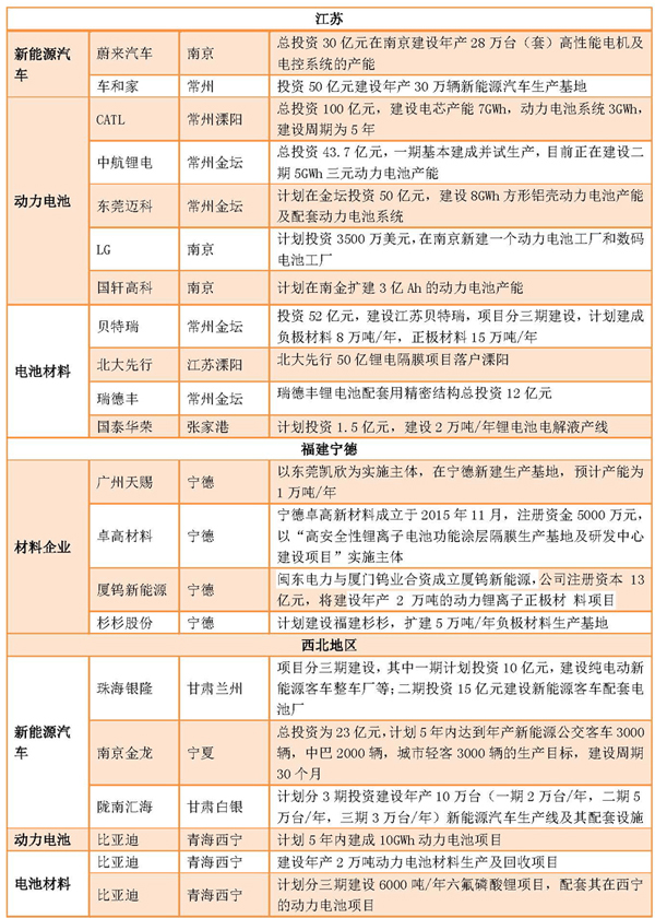 (1)江蘇——地方政策紅利+終端帶動(dòng)+產(chǎn)業(yè)外遷。從2016年企業(yè)外地建廠情況來(lái)看,江蘇常州成為最熱門的選址地區(qū),一是因?yàn)楫?dāng)?shù)卣畬?duì)鋰電池產(chǎn)業(yè)的大力支持,從車企到動(dòng)力電池企業(yè)再到材料企業(yè)均有涉及;二是,常州先后有北汽新能源、眾泰汽車等終端布局,從而帶動(dòng)動(dòng)力電池廠商投資,動(dòng)力電池廠商又帶動(dòng)關(guān)鍵材料等配套廠商。三是由于上海制造業(yè)外遷,江蘇由于地理優(yōu)勢(shì)和成本優(yōu)勢(shì)成為企業(yè)外遷的首選,因此企業(yè)在江蘇布局相對(duì)較多。