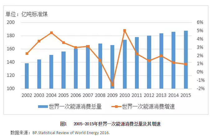 2012年以來,全球能源消費增速顯著趨于放緩。根據(jù)BP統(tǒng)計數(shù)據(jù),2012年之前的10年間,世界一次能源消費總量由2002年的138.8億噸標(biāo)準(zhǔn)煤增加到2012年的180.3億噸標(biāo)準(zhǔn)煤,年均增加近4.2億噸標(biāo)準(zhǔn)煤,年均增速為2.7%。這一時期較快增長的能源需求主要由高速發(fā)展的中國經(jīng)濟(jì)所拉動,10年間中國能源消費量增加了23.4億噸標(biāo)準(zhǔn)煤,占同期世界能源消費總增加量41.5億噸標(biāo)準(zhǔn)煤的56.4%。從2012年開始,世界能源需求呈現(xiàn)疲軟態(tài)勢,增速逐步放緩,2012年、2013年、2014年和2015年世界一次能源消費增速分別為1.4%、2.0%、1.1%和1.0%,顯著低于之前10年2.7%的年均增速(如圖1所示)。導(dǎo)致這一現(xiàn)象的原因主要有兩個:一是發(fā)達(dá)國家在經(jīng)歷2007、2008年金融危機(jī)后,經(jīng)濟(jì)尚未完全復(fù)蘇,能源需求疲軟。以北美、歐洲及歐亞地區(qū)為例,2015年北美一次能源消費量為39.9億噸標(biāo)準(zhǔn)煤,盡管與2012年相比略微增加,但仍低于2008年40.3億噸標(biāo)準(zhǔn)煤的消費量;歐洲及歐亞地區(qū)2015年一次能源消費量為40.5億噸標(biāo)準(zhǔn)煤,相比于2008年下降了6.2%[1]。二是新興市場國家經(jīng)濟(jì)增速放緩及產(chǎn)業(yè)結(jié)構(gòu)調(diào)整降低了能源需求增速。其中最具有代表的是中國,隨著經(jīng)濟(jì)發(fā)展進(jìn)入新常態(tài),產(chǎn)業(yè)結(jié)構(gòu)的深度調(diào)整和持續(xù)升級使得能耗較高的重工業(yè)在經(jīng)濟(jì)總量中所占的比重持續(xù)下降,能源需求進(jìn)入低速增長階段。中國的消費增速由2011年的7.3%下降到2015年的0.9%,趨近于世界平均水平[2]。另外,根據(jù)BP的統(tǒng)計數(shù)據(jù),中國能源消費的增長量占世界總增長量的比例由2011年的74.5%降到2015年的34.4%,對能源需求總量的拉動作用明顯減弱。