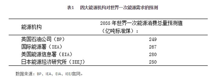 盡管當(dāng)前能源需求呈現(xiàn)疲軟態(tài)勢,但是亞洲、南美洲和非洲等新興市場國家經(jīng)濟(jì)仍有較大發(fā)展空間,工業(yè)化、城鎮(zhèn)化進(jìn)程將不斷推進(jìn),人口規(guī)模持續(xù)擴(kuò)大,未來將成為全球能源需求增長的主要驅(qū)動力。從BP、IEA等權(quán)威能源機(jī)構(gòu)的預(yù)測來看,盡管因為統(tǒng)計口徑及電力折一次能源方法不同導(dǎo)致對能源消費總量的判斷存在差異,但趨勢大體相同。到2035年,世界一次能源消費總量預(yù)計在249-280億噸標(biāo)準(zhǔn)煤的范圍內(nèi)波動(見表1)。其中,BP的預(yù)測最為保守,2035年世界一次能源消費總量將達(dá)到249億噸標(biāo)準(zhǔn)煤,較2015年增加約61億噸標(biāo)準(zhǔn)煤,累計增長34%,年均增長1.4%,增速與近幾年相比較有小幅的提升。