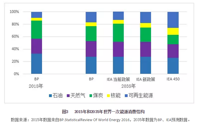 盡管短期內(nèi)化石能源作為主導(dǎo)能源的地位不會改變,但是受全球氣候變化、新技術(shù)的發(fā)展等因素的影響,未來能源結(jié)構(gòu)將會發(fā)生顯著變化。一方面,隨著2015年12月巴黎氣候大會的召開,迎來了人類應(yīng)對氣候變化的轉(zhuǎn)折點?!栋屠鑵f(xié)定》提出控制全球平均氣溫升幅在2℃之內(nèi),到2030年全球碳排放量控制在400億噸,2080年左右實現(xiàn)凈零排放,并努力將氣溫升幅限制在1.5℃之內(nèi),2060年左右實現(xiàn)凈零排放。要達(dá)到上述目標(biāo),到本世紀(jì)下半葉,全球要逐漸結(jié)束化石能源時代,建立起以新能源和可再生能源為主體的低碳甚至零碳能源體系。為此各國都在不斷加大節(jié)能減排和推動可再生能源發(fā)展的力度,在可預(yù)見的未來,化石能源所占比重將不斷下降,同時可再生能源的比重不斷上升。另一方面,由于新技術(shù)的發(fā)展,天然氣的開采成本越來越低,且作為一種相對清潔、低碳的燃料,天然氣將取代煤炭成為第二大燃料。據(jù)BP預(yù)測數(shù)據(jù),到2035年,石油、煤炭在一次能源消費中的占比分別約為28%、24%,與2015年相比,都下降了近5個百分點;天然氣的比重與2015年相比提升了1個百分點,約為25%;核能在一次能源消費中的占比仍然較低,但也提升了1.5個百分點左右;可再生能源的比重變化最大,在未來的20年里上升了近7.5個百分點。