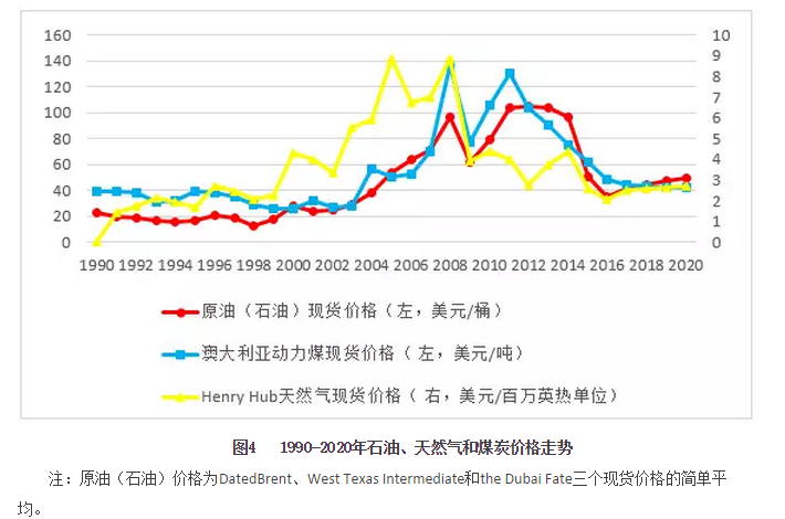 在能源價格中,油價具有典型的代表意義。一方面因為在眾多領(lǐng)域中用到的燃料和產(chǎn)品大多來自于石油。另一方面,煤炭的價格一直以來受到石油價格的直接影響,走勢大致相同;近幾年來,天然氣價格似乎已經(jīng)擺脫了隨油價而波動的趨勢(如圖4所示),然而與石油不同,天然氣尚未形成全球性的統(tǒng)一市場,北美、歐洲和亞太這三大天然氣市場氣價形成機(jī)制不同,導(dǎo)致價格存在明顯的差異(圖中采用的是北美HenryHub天然氣現(xiàn)貨價格,遠(yuǎn)低于亞洲LNG市場價格)。從石油價格來看,在1990年到2002年期間,石油價格相對平穩(wěn),基本維持在20美元/桶左右;從2003年到2008年,石油價格由28.9美元/桶飆升至97.0美元/桶;受2008年金融危機(jī)的影響,2009年石油價格達(dá)到局部最低點,此后又開始回升,到2012年,達(dá)到歷史最高點-105.0美元/桶;2013年到2015年,石油價格由104.0美元/桶跌至50.8美元/桶,年均每桶下降26.6美元。煤炭的價格走勢基本與石油同步,在經(jīng)歷了2009年價格下跌之后,2011年又重新回到每噸130.1美元的價格高點,之后一直到2015年,煤炭的價格不斷下跌。天然氣的價格在2012年短暫的擺脫了隨油價波動的趨勢,然而從2014年開始,又隨著石油價格的降低而降低。由此可見,當(dāng)前受全球能源供過于求的影響,能源價格持續(xù)低迷。