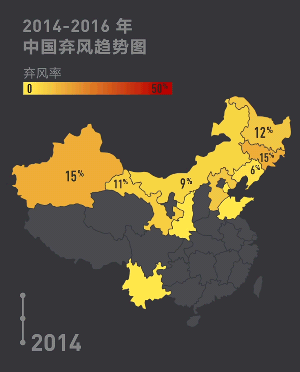 2014至2016年,中國部分地區(qū)棄風(fēng)呈攀升趨勢,日益惡化:2016年棄風(fēng)總量高達(dá)497億千瓦時(shí),是2014年的4倍!上圖中顏色最深的甘肅、新疆、內(nèi)蒙古、吉林和黑龍江五個(gè)地區(qū),3年棄風(fēng)量就接近800億千瓦時(shí),相當(dāng)于天津市2015年全年的用電量。其中,甘肅省的棄風(fēng)率更是從2014的11%飆升到2015年的43%!