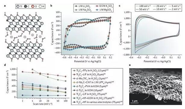 電化學(xué)電容器:極性有機(jī)分子和金屬離子可以很容易地嵌入MXene層間占據(jù)表面化學(xué)活性位點(diǎn)參與儲(chǔ)能。Ti3C2Tx電極的體積容量可達(dá)300–400 F cm?3,不同電解液中均可保持較高的容量,且不同的MXenes在不同電解液中均有很好的倍率性能(圖7.b,c,d)。
