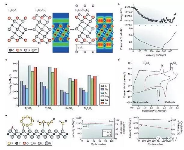 MXenes具有較高的理論比容量,表面含氧官能團(tuán)有利于其儲(chǔ)能性能的提高。在鋰電應(yīng)用方面,理論與實(shí)際實(shí)驗(yàn)證明,在充放電過(guò)程中過(guò)渡金屬氧化態(tài)在不斷改變。以Ti3C2Tx為例(圖6.a,b),得益于材料2D導(dǎo)電特性,Li可在材料表面形成可逆層,減小Li離子擴(kuò)散電阻。MXenes的2D層間可適應(yīng)不同直徑的離子,理論計(jì)算Na、K、Mg、Ca和Al-ion 電池容量見(jiàn)圖6.c。不同的MXenes可提供不同的電位窗口,使其可作負(fù)極材料也可作為正極材料使用(圖6.d)。由于MXene表面官能團(tuán)與多硫化物有很強(qiáng)的作用力,因此Ti2CTx或Ti3C2Tx作為硫的導(dǎo)電載體在鋰硫電池中表現(xiàn)出優(yōu)異的倍率性能和循環(huán)穩(wěn)定性(圖6.e)。