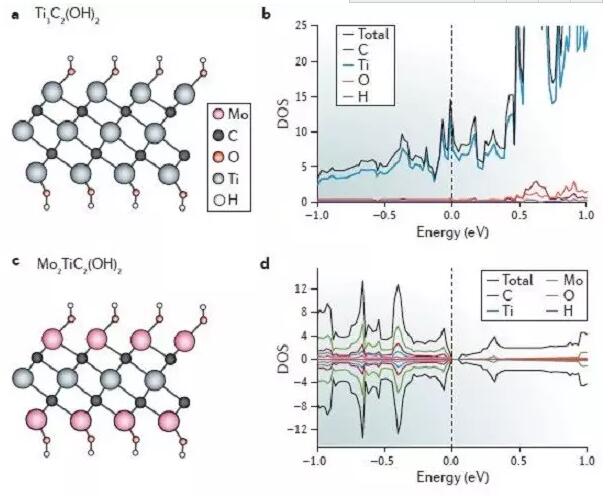 (c,d)表面有OH-的Mo2TiC2的原子分布以及計(jì)算狀態(tài)密度 (DOS)示意圖