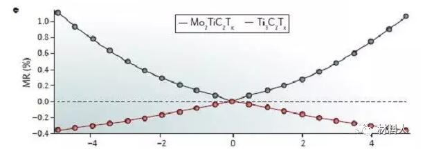 (e)10 K下Mo2TiC2和Ti3C2的磁阻 (MR)圖