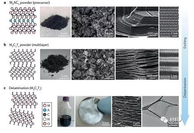 (c)剝落狀MXene (Ti3C2Tx)從左向右:原子結(jié)構(gòu)示意圖、400ml水中剝落Ti3C2Tx照片、真空過(guò)濾制備的Mo2TiC2Tx膜照片、Mo2TiC2Tx薄膜SEM圖、單層Ti3C2Tx薄片TEM圖