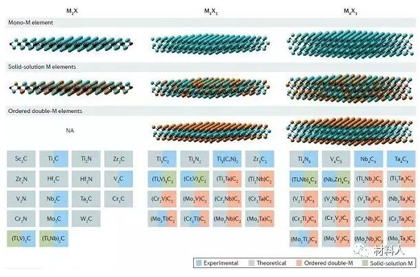 圖1 目前報(bào)道的MXenes組成結(jié)構(gòu)分類圖,圖中是MXenes三種不同的結(jié)構(gòu)以及元素組成