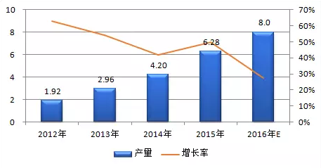 隨著新能源汽車持續(xù)快速發(fā)展,動力電池市場需求日趨擴大。最新公開數(shù)據(jù)顯示,2016年中國汽車動力電池產(chǎn)量為30.5GWh,同比增長82%。聯(lián)動效應(yīng)下,上游隔膜材料同樣產(chǎn)銷兩旺。2016年中國鋰電池隔膜產(chǎn)量達(dá)到9.29億平米,同比增長33.03%。