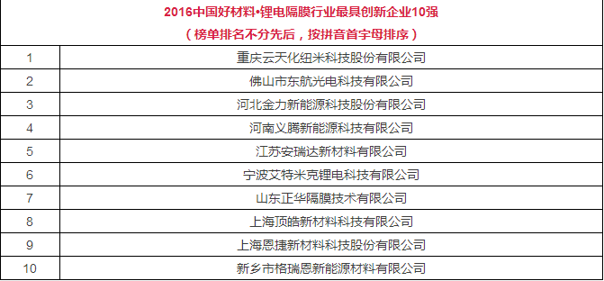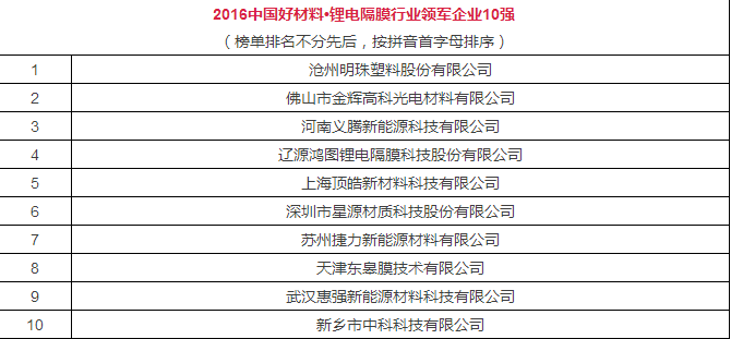 以下是2016中國好材料˙鋰電隔膜行業(yè)榜單: