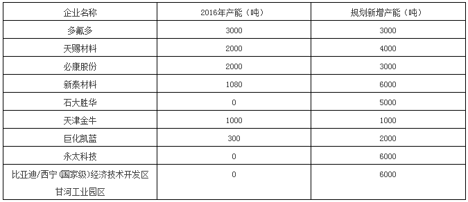 中國六氟磷酸鋰生產(chǎn)企業(yè)2016年產(chǎn)能及規(guī)劃新增產(chǎn)能