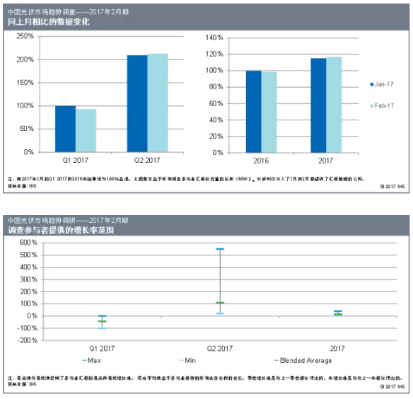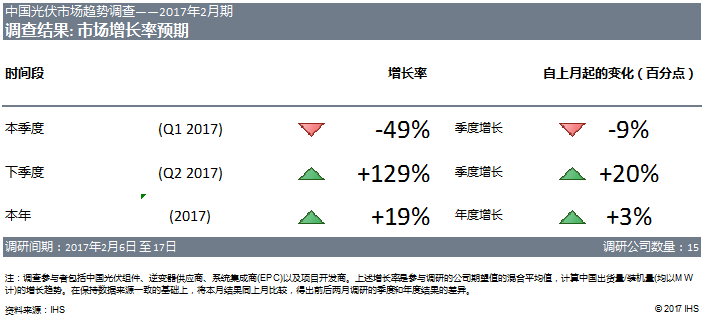 * 盡管政策環(huán)境錯(cuò)綜復(fù)雜,中國(guó)光伏供應(yīng)鏈依然對(duì)2017年的市場(chǎng)充滿信心。結(jié)果顯示大多數(shù)參與調(diào)研的公司相信,2017年度增長(zhǎng)為19%,相比于一月份的調(diào)查結(jié)果增長(zhǎng)了3個(gè)百分點(diǎn)。此調(diào)研數(shù)據(jù)顯著高于IHS此前對(duì)2017年裝機(jī)量的預(yù)估。