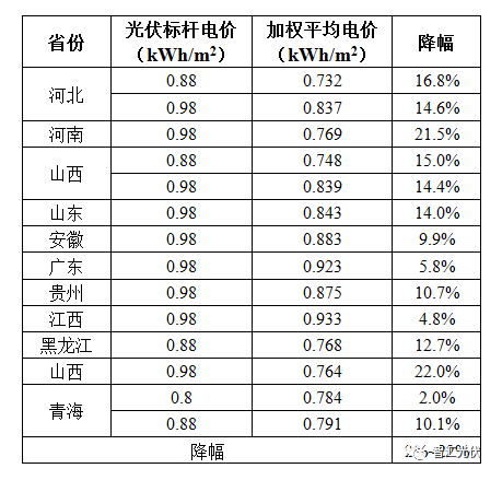 根據(jù)各省公布的項(xiàng)目中標(biāo)情況,對中標(biāo)項(xiàng)目的加權(quán)電價(jià)進(jìn)行匯總,如下表所示。