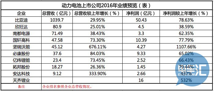 根據(jù)統(tǒng)計,截至2017年2月23日,122家公布2016年年報業(yè)績預(yù)告的鋰電池公司中,按照預(yù)告凈利潤最大變動幅度來看,近八成企業(yè)實現(xiàn)了凈利潤增長。其中,預(yù)告凈利潤最大增幅度同比超過100%的企業(yè)達到48家;預(yù)告凈利潤上限超1億元的企業(yè)高達68家。印證了2016年在新能源汽車產(chǎn)銷突破50萬輛的大背景下,新能源汽車產(chǎn)業(yè)鏈尤其是鋰電池產(chǎn)業(yè),一片欣欣向榮的發(fā)展勢頭。