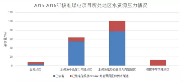 令人擔(dān)心的問題是,近幾年的政策將新增煤電產(chǎn)能集中分布在了水資源最為匱乏的地區(qū):2016年核準的煤電項目(11GW)中一半位于水資源高壓地區(qū),其中只有4GW被叫停。2015-2016年,在水資源高壓地區(qū)有77GW煤電項目獲得核準或開工建設(shè),而僅24GW被叫停。