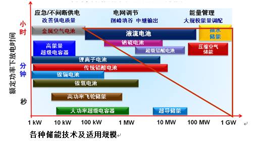 為滿足不同應用領域的需要,人們已研究開發(fā)出多種儲能技術,如圖1 給出了已開發(fā)的各種儲能技術及其適用范圍,這些儲能技術具有各自的特點和適用領域。一般說來,風能、太陽能等可再生能源發(fā)電系統(tǒng)對儲能技術的功率和可逆存儲容量有較高的要求。抽水儲能技術、液流電池技術、鋰離子電池技術、超級鉛酸電池技術等在大規(guī)模儲能技術領域具有較好的應用前景。 在眾多的儲能技術中,液流電池儲能技術具有能量轉換效率高、蓄電容量大、選址自由、可深度放電、安全環(huán)保等優(yōu)點,成為大規(guī)模高效儲能的首選技術之一。