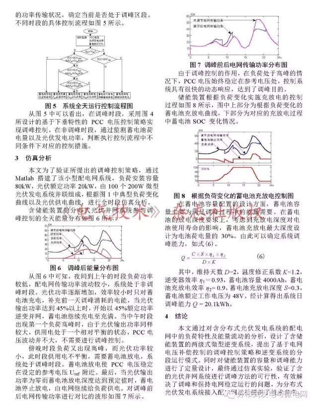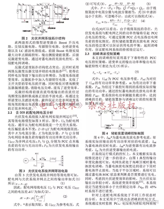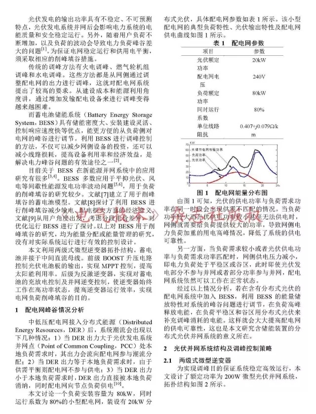 中國儲能網(wǎng)訊:北方工業(yè)大學、北京電動車輛協(xié)同創(chuàng)新中心的研究人員張明、樸政國,在2016年第12期《電氣技術(shù)》雜志上撰文,針對配電網(wǎng)負荷需求變化引起的電力峰谷問題,本文研究了含儲能的分布式光伏并網(wǎng)系統(tǒng)對配電網(wǎng)削峰填谷的控制策略。設(shè)計了兩級式微型逆變系統(tǒng),提出了基于并網(wǎng)點電壓補償?shù)恼{(diào)峰控制策略。