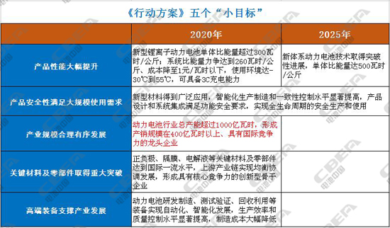 《行動(dòng)方案》從產(chǎn)品性能、產(chǎn)品安全、產(chǎn)業(yè)規(guī)模、關(guān)鍵材料和零部件以及高端裝備方面定下了五個(gè)“小目標(biāo)”,以2020年和2025年為時(shí)間節(jié)點(diǎn),分別制定了汽車動(dòng)力電池產(chǎn)業(yè)到這些節(jié)點(diǎn)應(yīng)該達(dá)到的水平。